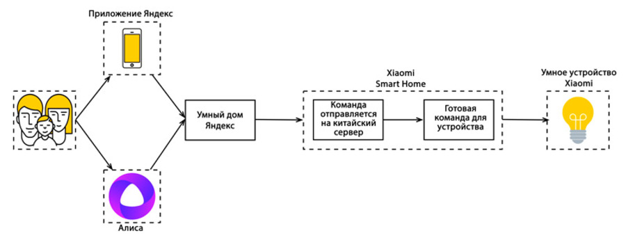 Основной особенностью функционирования голосовых помощников является их работа через “облако” в интернете. Там осуществляется распознавание голосовой команды, далее она передается в систему “Умный дом”, а после на источники света.