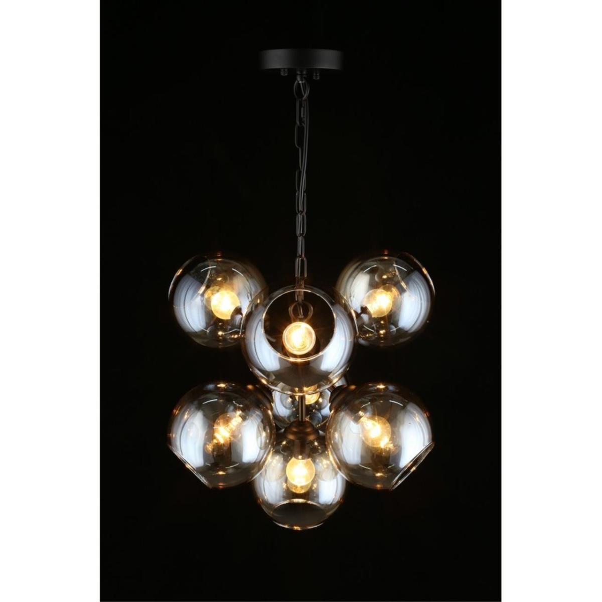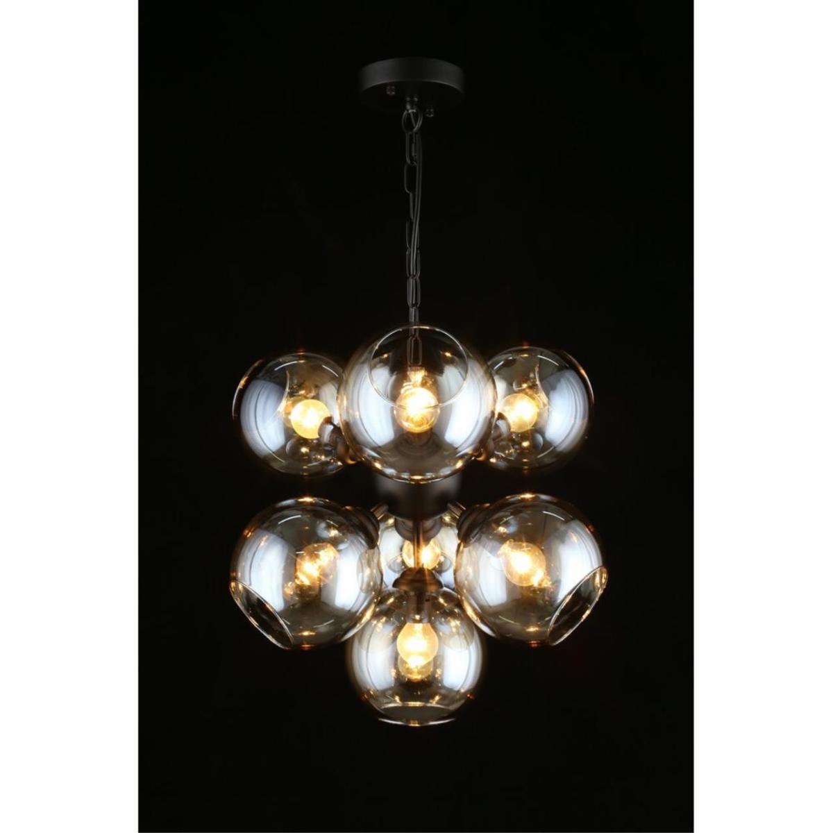 Дымчатое стекло смягчает яркость, черная арматура подчеркивает геометрию пространства, а семь источников света помогают создать комфортный сценарий в гостиной или столовой зоне.