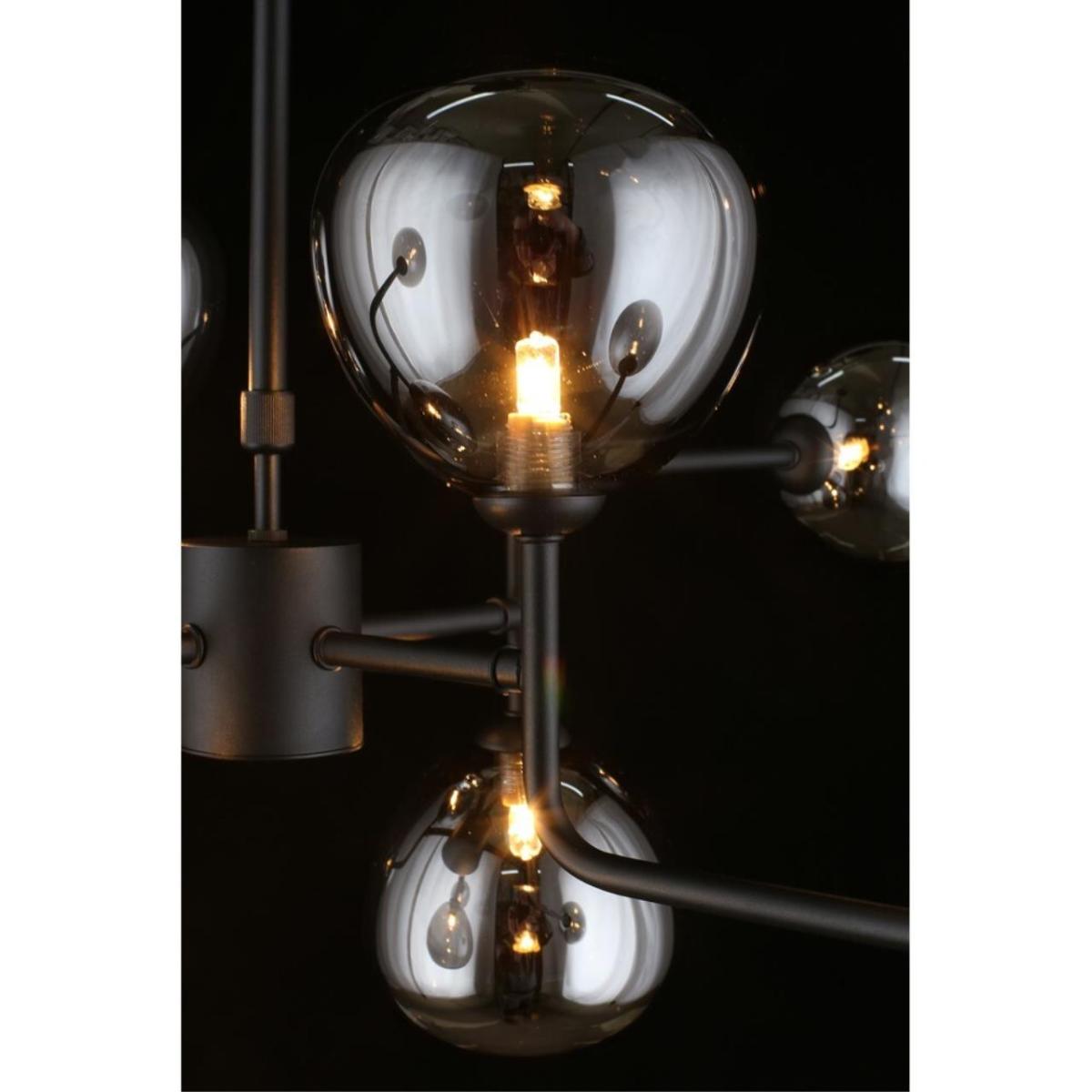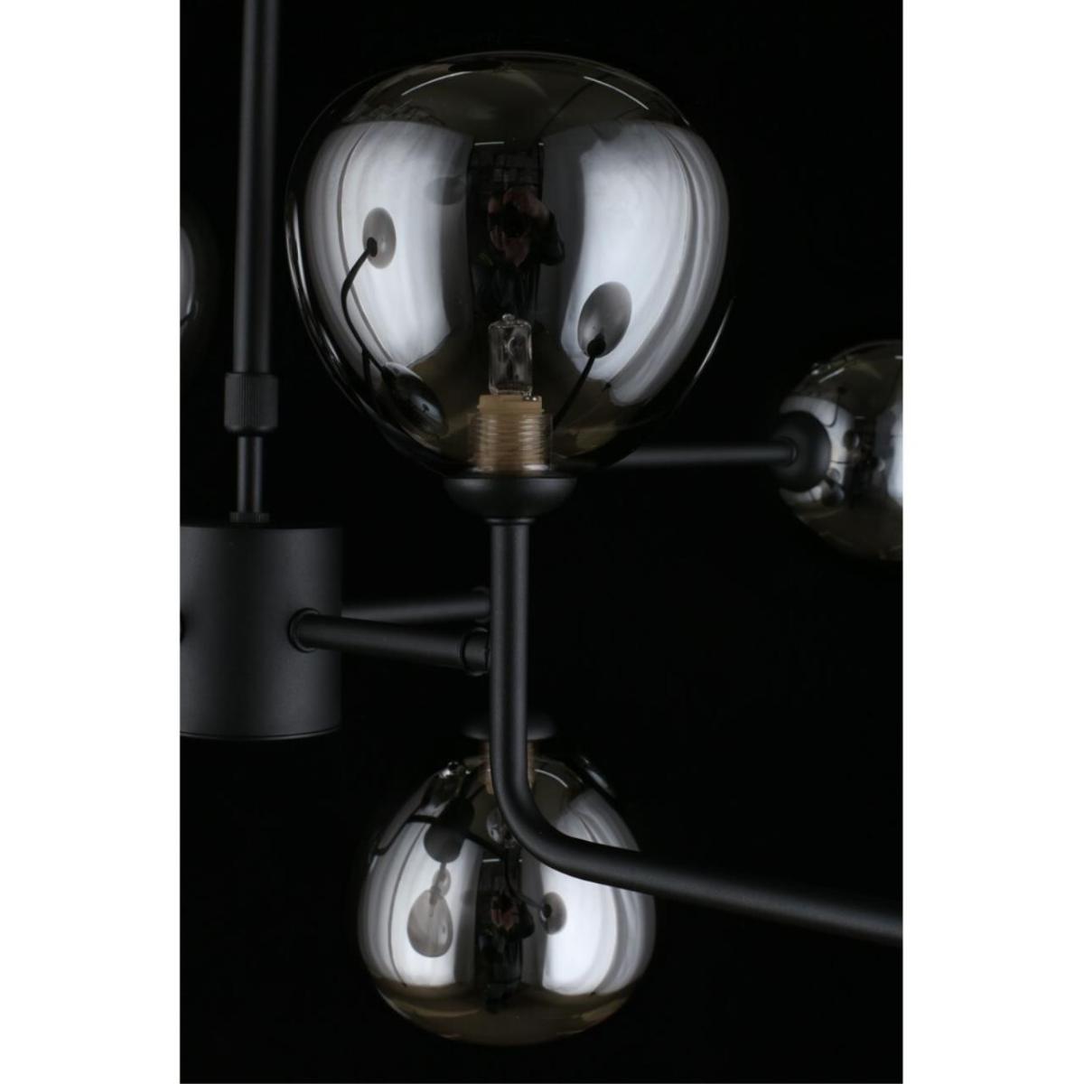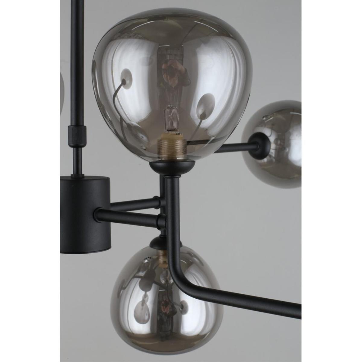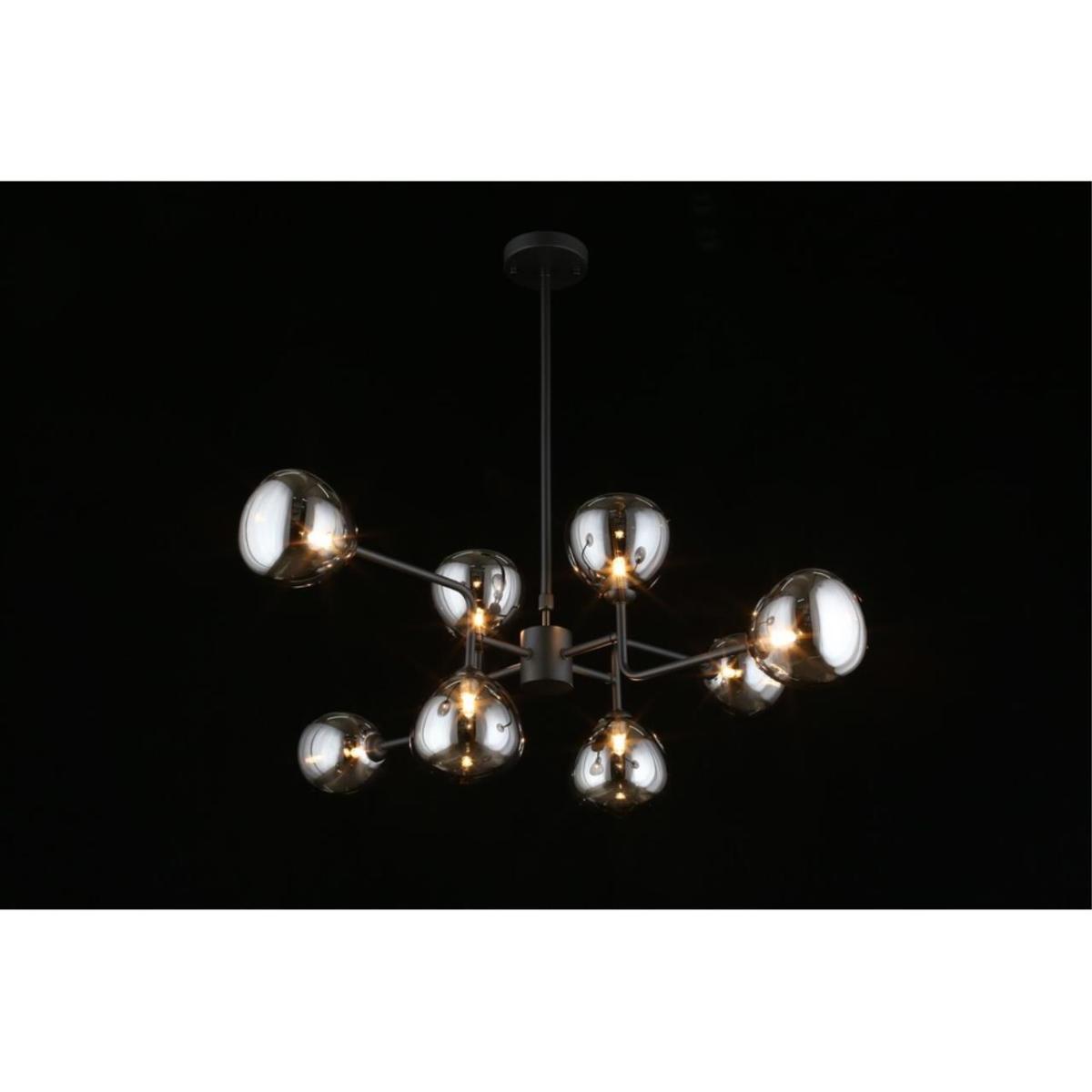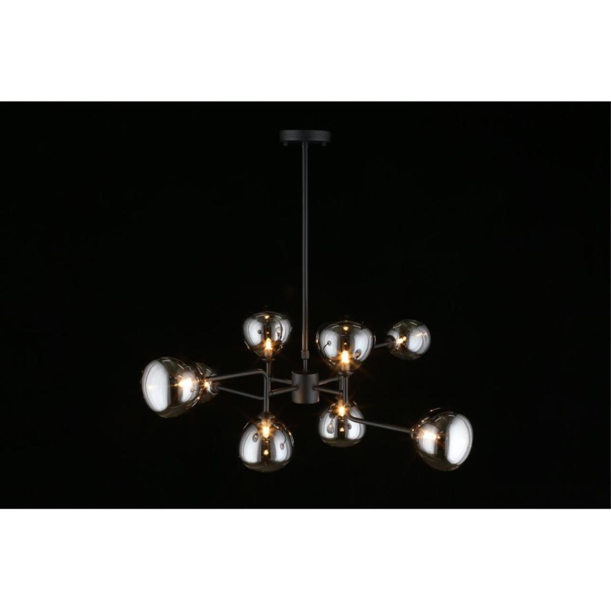 Подвесная люстра Aployt Roser APL.913.07.08 создает выразительный световой акцент в современной гостиной. Диаметр 800 мм и высота 450 мм визуально выстраивают пространство, а восемь овальных плафонов из дымчатого стекла направлены в стороны и дают мягкое, объемное сияние без бликов. Черная металлическая арматура подчеркивает стиль хай-тек и выглядит строго и актуально.