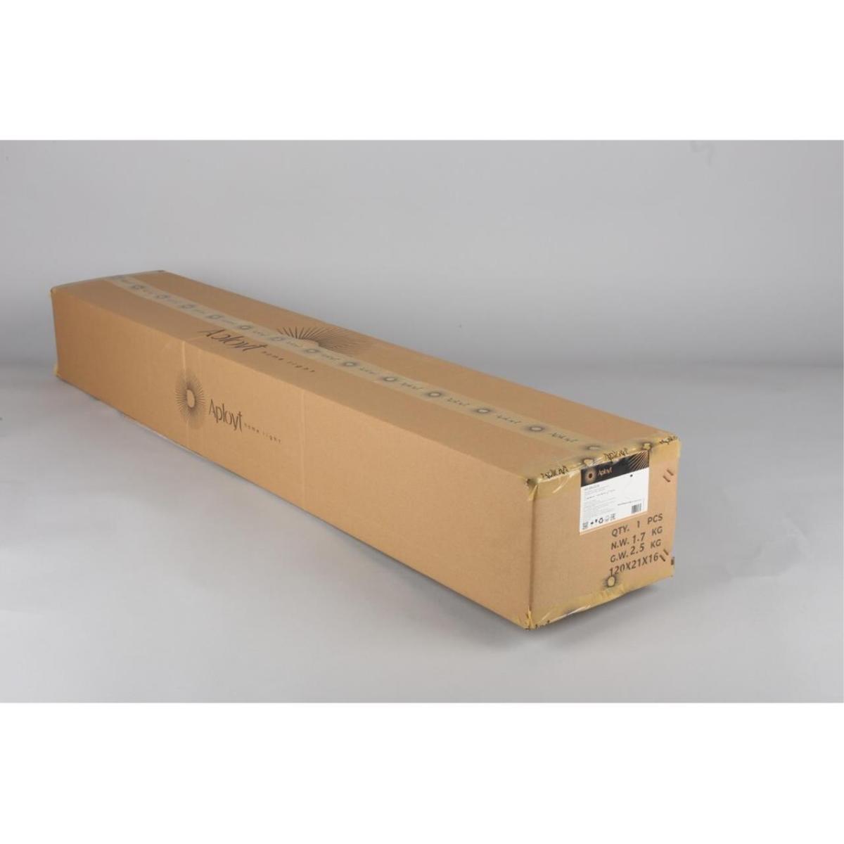 Люстра имеет продолговатую композицию длиной 1180 мм и шириной 100 мм, высота корпуса с подвесом достигает 1200 мм. Длина подвеса 1000 мм, крепление на потолок выполняется через надежную планку, поэтому установка аккуратная и визуально легкая. Потолочная конструкция совместима с натяжными потолками, степень защиты IP20 подходит для сухих помещений.
