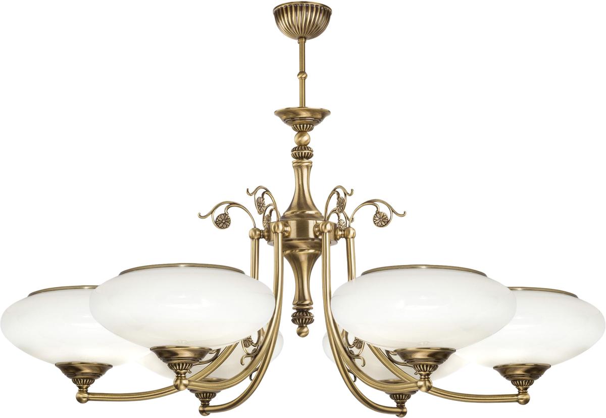 Диаметр 870 мм и высота 700 мм подходят для просторных комнат. Шесть овальных плафонов из бежевого стекла направлены вверх, свет отражается от потолка и становится мягче и комфортнее для глаз. Металлическая арматура в цвете бронзы выглядит благородно и устойчиво к износу.