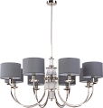Восемь цилиндрических абажуров из плотной серой ткани направлены вверх, свет получается мягким и равномерным, без бликов. Никелированная арматура подчеркивает графичность формы и легко вписывается в нейтральные и сложные цветовые палитры гостиных. Монтаж на штанге поддерживает идеальную геометрию композиции и аккуратный вид под потолком.