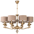 Арматура из латуни в цвете бронза, восемь цилиндрических абажуров из коричневой ткани. Свет направлен вверх, отражается от потолка и даёт мягкую, уютную атмосферу без резких бликов.