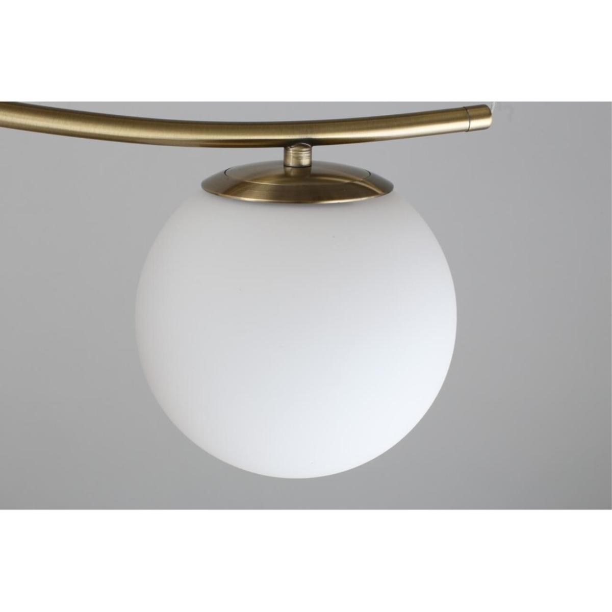 Подвесная люстра Omnilux Acciano OML-94903-05 создаёт ясный, спокойный свет и мягко собирает пространство вокруг стола. Белые шарообразные плафоны из стекла дают ровное свечение без бликов, а тёплая бронза металлической арматуры добавляет интерьеру тактильной глубины. Линейная композиция длиной 780 мм и шириной 150 мм аккуратно отделяет обеденную или рабочую зону на кухне, высота 900 мм поддерживает ощущение воздушности.