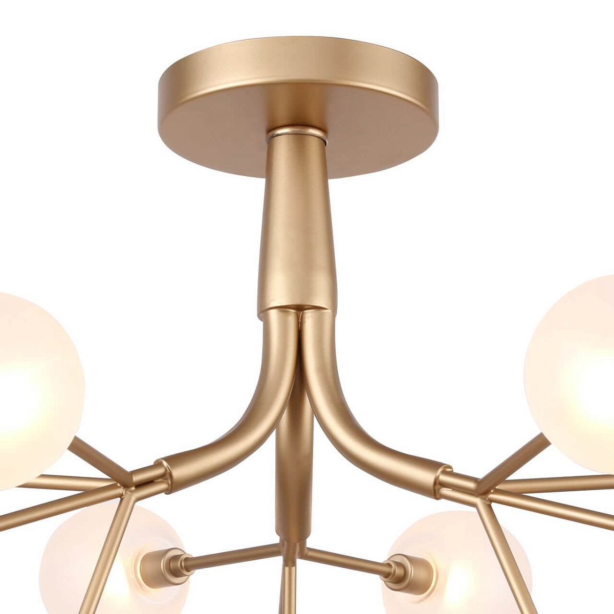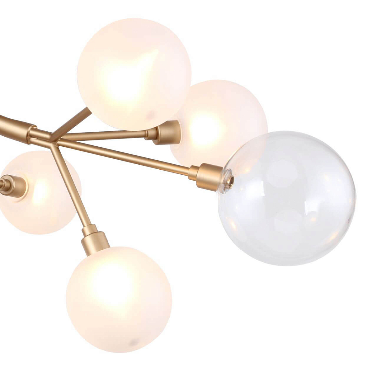 Арматура из металла цвета матовое золото. Плафоны из белого стекла, форма круглая. Всего 12 плафонов, ориентированных в стороны, свет распределяется по периметру помещения. Стиль исполнения современный.