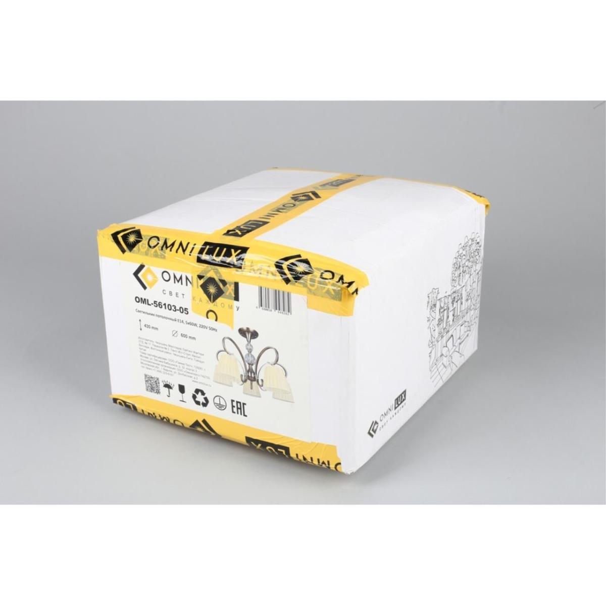 Люстра рассчитана на лампы накаливания E14, по 60 Вт каждая, суммарная мощность 300 Вт. Оптимальная площадь освещения до 15 м², питание 220 В. Степень защиты IP20 подходит для сухих помещений. Конструкция монтируется на потолок и подходит для натяжных потолков.