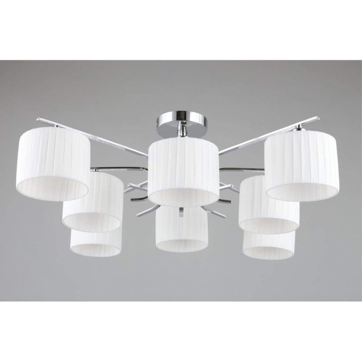 Модель уместна в гостиную, где требуется ровный свет без слепящих пятен. Цилиндрические абажуры из белой ткани долго сохраняют аккуратный вид, их легко протирать сухой салфеткой. Хромированная арматура подчеркивает линии мебели и зеркальные детали. Артикул OML-34207-08 помогает быстро найти расходники и инструкции. При высоте 290 мм потолочная установка не перегружает комнату, а широкая композиция 900 мм красиво раскрывается в центре зоны отдыха. Смотрится особенно выразительно.